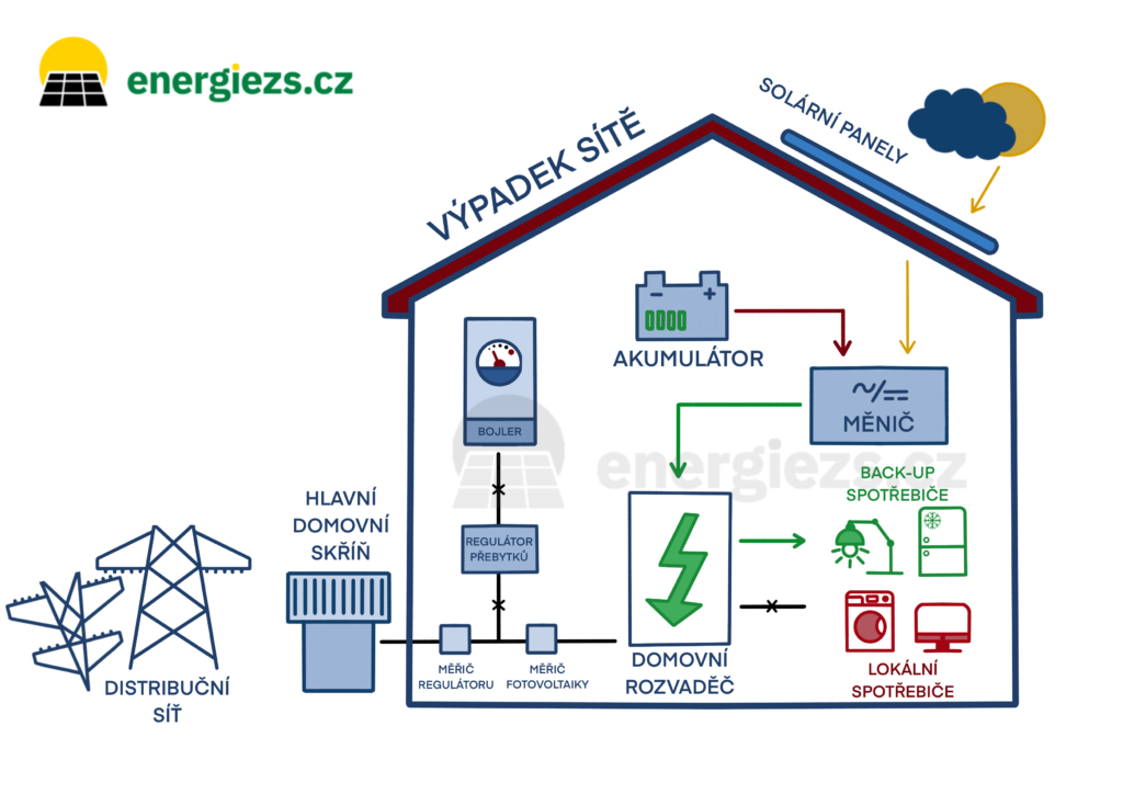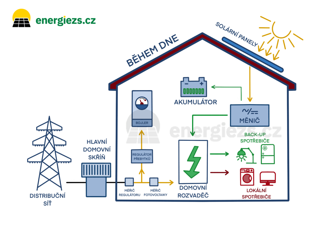 Panely nejčastěji vyrábí více energie, něž domácnost spotřebuje. Přebytečnou energii si uložíte do baterie pro pozdější využití. Je zde možnost přebytečnou energii použít i pro ohřev vody v bojleru. Tímto způsobem minimalizujete svou závislost na dodavatelích energie a šetříte tak nemalé peníze.